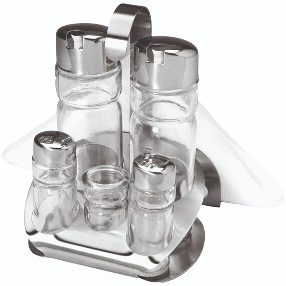 Περιλαμβάνει φιάλες για λάδι και ξύδι, αλατιέρα, πιπεριέρα, θήκη οδοντογλυφίδων και πετσετοθήκη.