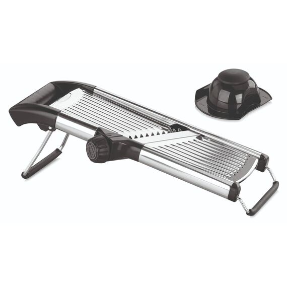 Από ανοξείδωτο ατσάλι και μαύρο ABS. Έχει ρυθμιζόμενο πάχος φέτας από 0,5 έως 9mm και κοπή Julienne 4,5x4,5mm, 9x9mm,.Αναδιπλούμενη βάση.